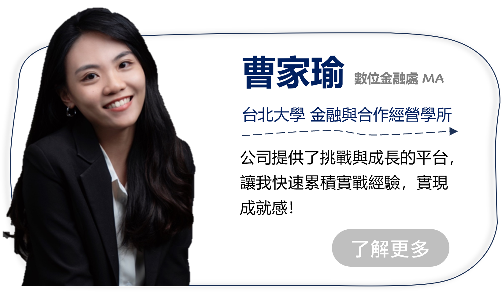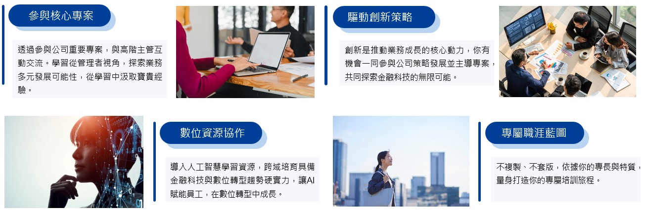 參與重點專案,從協作中鍛鍊企劃力,引導從不同角度培養宏觀思維,成為公司金融創新策略幕僚關鍵人才。