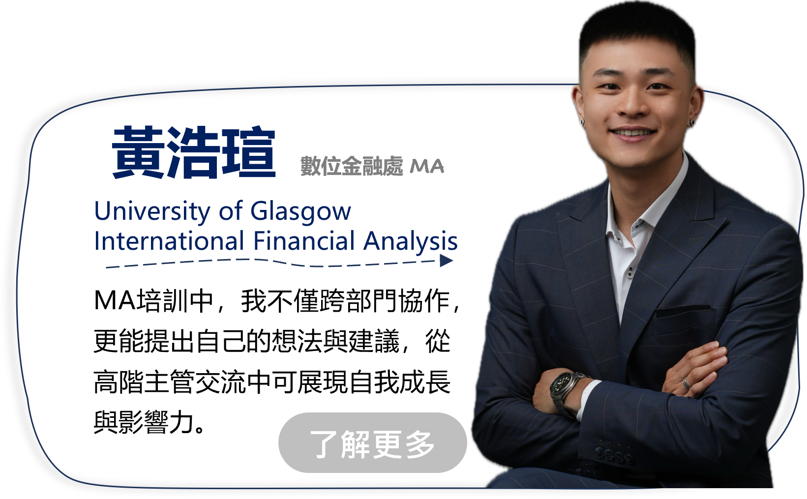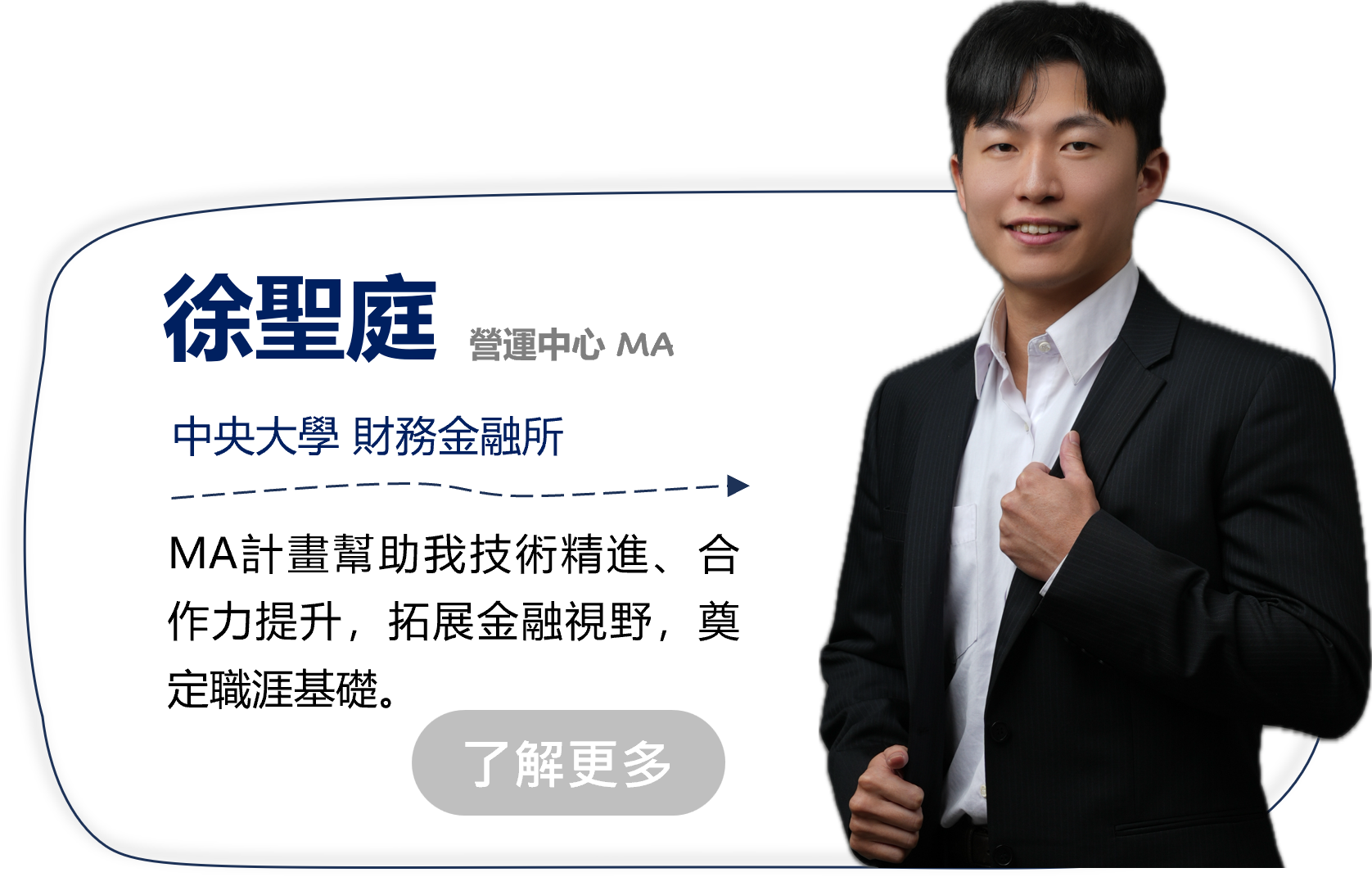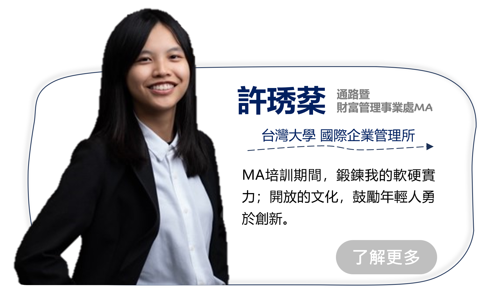 MA計畫以系統性培訓金融專業、策略性輪調及專案性實戰,可免於在過長的輪調期間淪於高薪實習生的無奈,所以你的心態需先做好迎戰準備,在我們的MA計劃中,沒有「實習」,只有「實戰」! |
