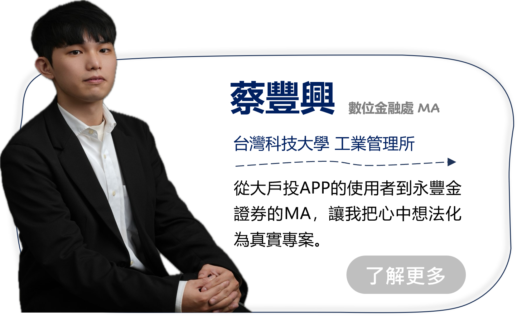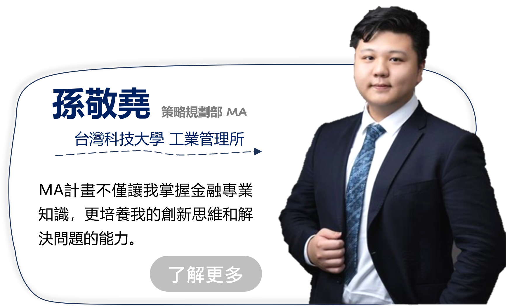 Q1|為何我要選擇永豐金證券MA計畫? ▼證券業每天面對瞬息萬變的市場與龐大交易,是金融業中最知識密集的一環。我們積極推動數位轉型,透過MA計畫讓你學習前沿金融知識、參與創新專案,發揮創意、不受框架限制,在競爭激烈的市場中保持優勢。