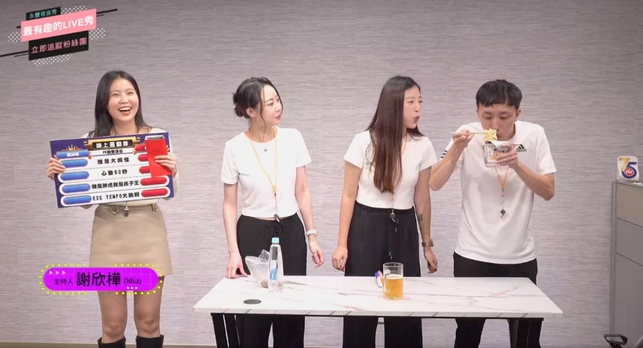 「ESG tempo大挑戰」為節目中一大亮點,不僅考驗參賽者ESG理解程度,過程中更安排「觀眾題」有獎徵答,如「自備環保杯成為不塑之客?」、「還海行動的1095代表著什麼含意?」、「ESG中的E環境保護是最重要的?」等,讓ESG變得生動易懂,直播中的觀眾在娛樂的同時,也能了解到ESG的起源與重要性,整場直播共高達3,188則留言數,永豐期貨希望透過這樣的宣導,能引導大眾關注並參與永續發展。