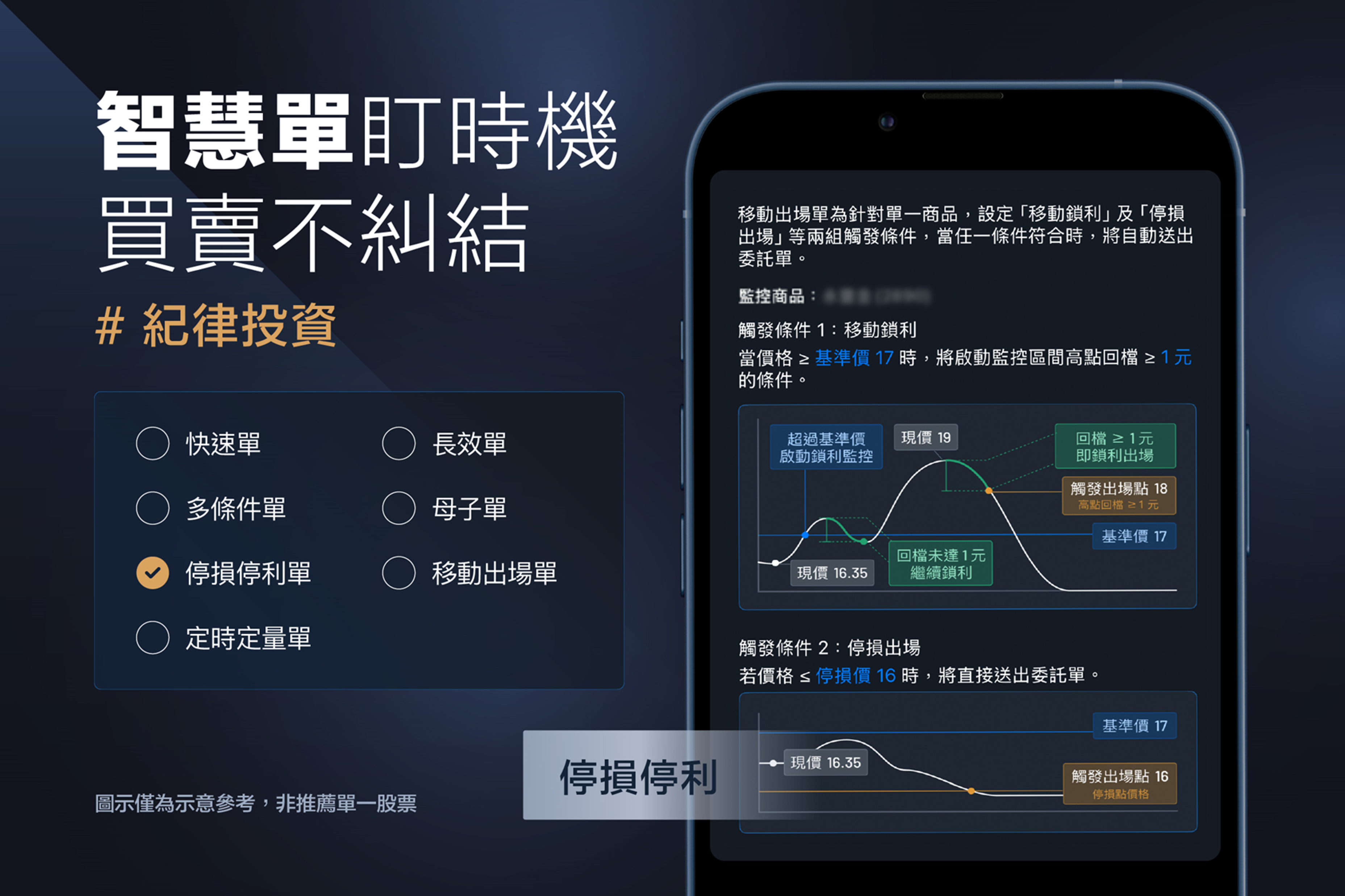 永豐金證券表示,面對市場突發波動,投資人容易出現「跌不敢買、漲追不到」的行為模式,因此推出符合不同使用情境的「智慧單」功能,協助提升交易紀律,包括快速單、停損停利單、長效單、移動出場單與多條件單。投資人只需事先設定條件,系統即可在快市波動中自動執行,減少盯盤壓力並提升操作效率。