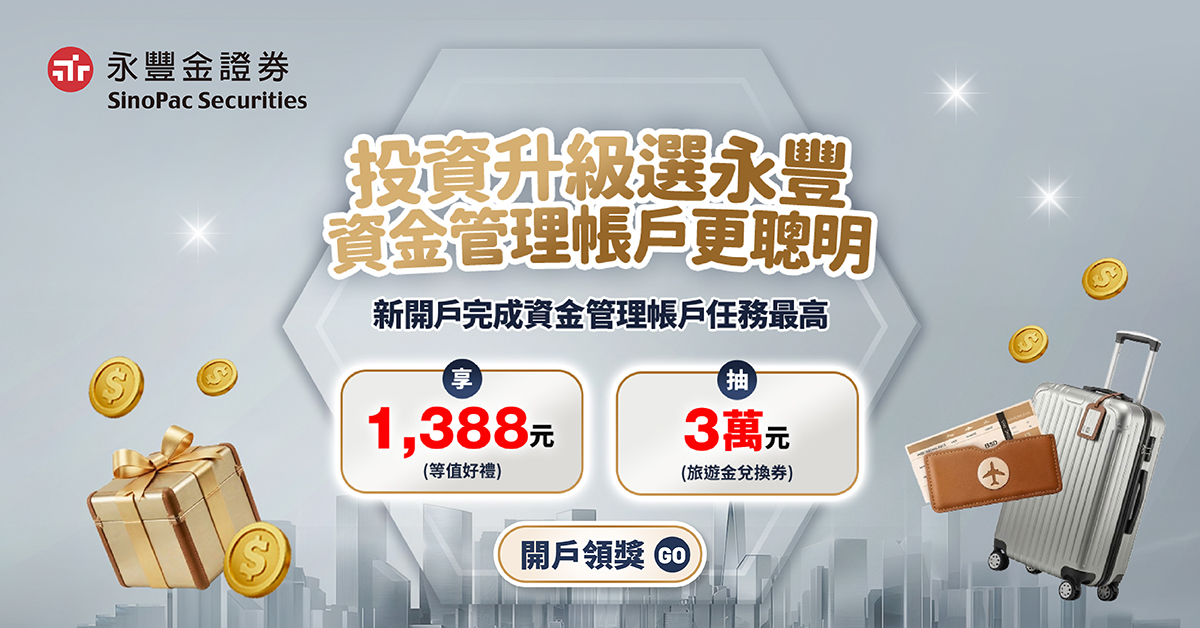 透過永豐金證券資金管理帳戶,投資人可享24小時即時出入金、免匯費服務,資金調度不受銀行營業時間限制,也無須臨櫃辦理。活動期間,新舊戶首次申辦享全家虛擬禮物卡回饋,依完成條件首次入金與交易滿額抽,最多加送500元及抽3萬旅遊金,再同時享有: