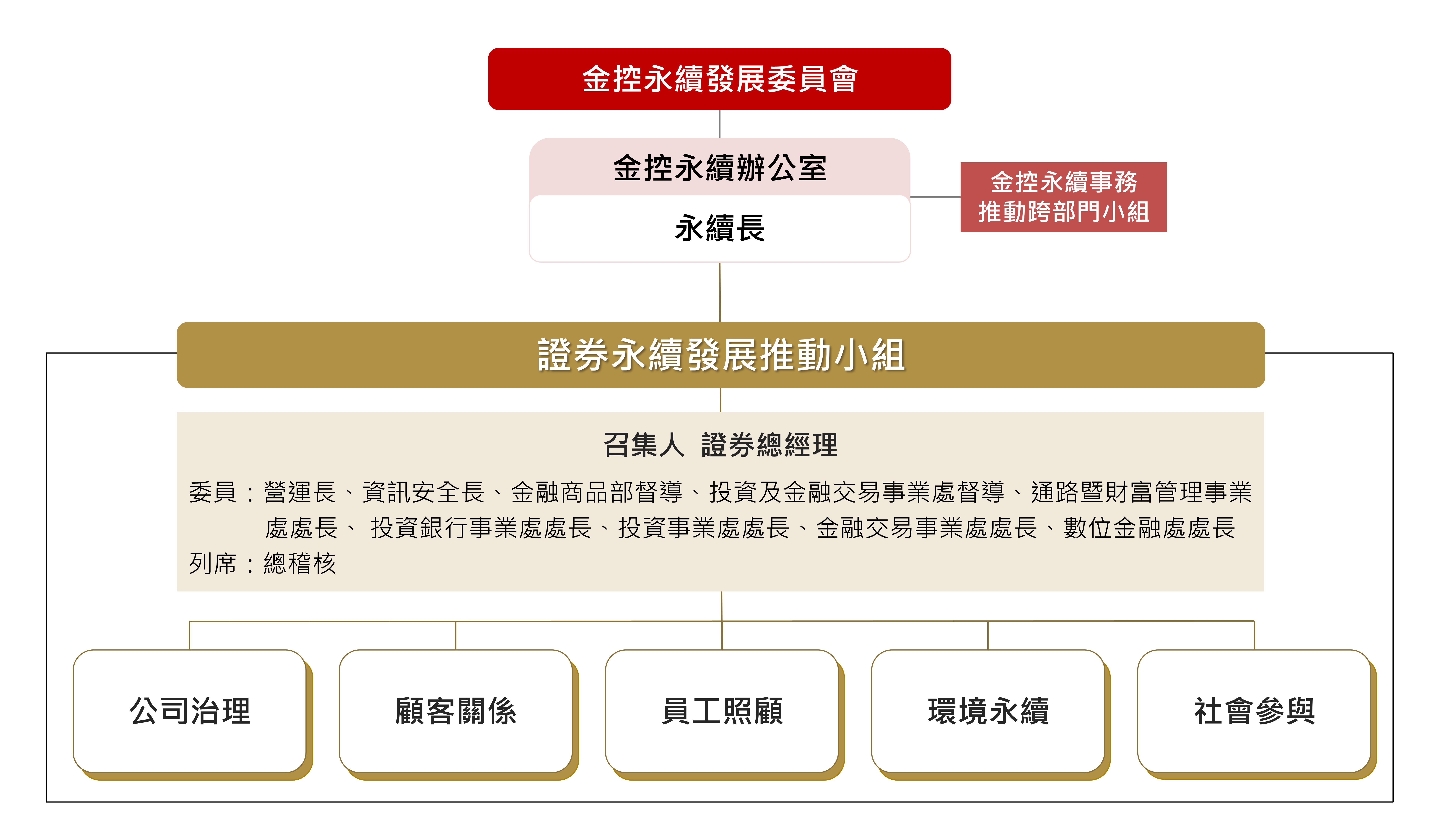 本公司永續發展推動小組由總經理擔任召集人。委員由事業處主管及總經理指定之主管擔任;執行秘書由總經理辦公室主管擔任,承召集人之命負責統籌推動小組相關行政事務,包括永續報告書資料整合及報告書發布。永續發展推動小組下設置公司治理、顧客關係、員工照顧、環境永續、社會參與等五個工作小組,負責訂定永續發展政策、制度及相關管理計畫並協同各單位推動永續發展相關活動。各工作小組組長由召集人指派適當人員擔任。