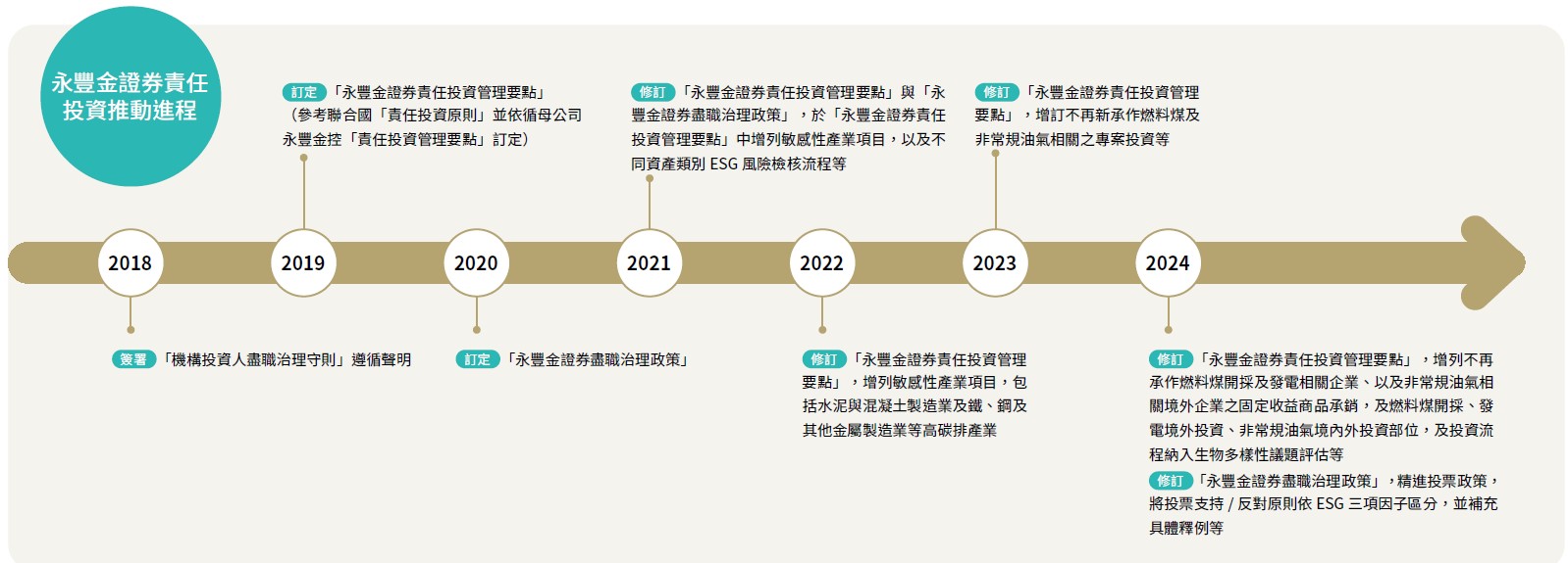 永豐金證券於2018年07月16日簽署「機構投資人盡職治理守則遵循聲明」,簽署後每年度定期發布盡職治理報告,參考「機構投資人盡職治理守則」及聯合國「責任投資原則」,並依母公司永豐金控「永續金融政策」、「責任投資管理要點」及「氣候相關風險與機會管理要點」制定「責任投資管理要點」,作為本公司投資與資產管理業務綱領,將ESG 議題與相關風險納入業務之決策流程,訂定評估ESG 風險之方法工具及責任投資相關規章,落實責任投資。