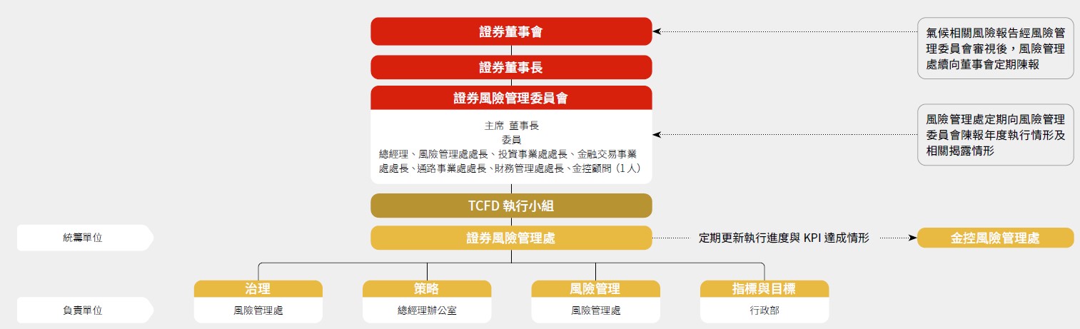 本公司於董事長轄下設有「風險管理委員會」,由董事長擔任召集人,執行董事會對於氣候風險管理政策之重大決策及相關事務,並建立相關督導及呈報機制、監督公司氣候風險管理之運作。